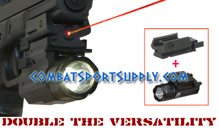 Pistol Mount Laser combo and LED flashlight kit with quick release. These are two detachable units that can be mounted in just a few seconds. They fit most weaver style rails. They’re built like a rock!!!