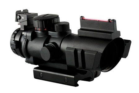 The AIM Sports Fiber Optic 4×32 Red/Green Dot Tactical Compact Scope is an extremely modular scope that is perfect for any type of game play. This scope features a fixed 4×32 illuminated zoom for those long range shots or spotting out enemy players at a distance. Also featured on this optic are iron sights mounted on the top of the optic for close range engagements, a fiber optic front sight and adjustable rear sight offer maximum accuracy and quick target acquisition. Lastly there are two small rails on the left and right side of the scope for even more optic mounting options. The Body of this Scope features a heavy duty construction that can easily handle any thing you can throw at it.