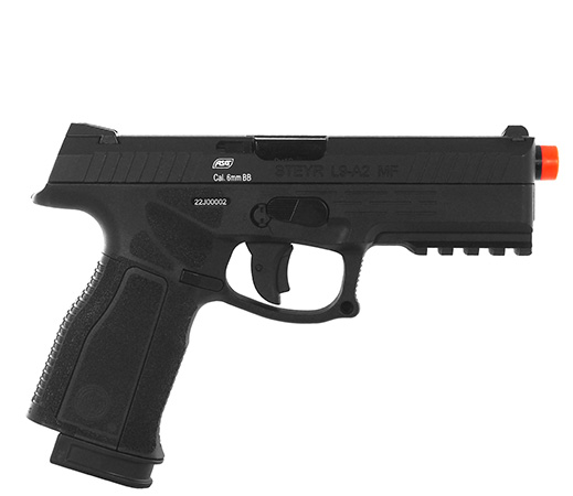 The Steyr L9-A2 marks a milestone as the first Steyr licensed full blow back gas/CO2 pistol from Action Sport Games. The L9-A2 looks and feels like nothing else on the airsoft market today with its futuristic looks, low bore axis, and realistic crisp trigger. Faithfully replicating the real version, the airsoft L9-A2 has a metal slide with polymer railed frame, key-style secondary safety, and the unique triangular iron sights. Included with the L9-A2 are three sizes of back straps and two sizes of side panels that allow the shooter to customize the grip size to their hand.