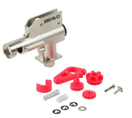 The Bravo Enhanced hop up chamber is the perfect upgrade for a player that is looking to take their accuracy and consistency to the next level. Most AEGs come stock with a plastic hop up chamber that can flex or deform, reducing the consistency of the air flow and hop up pressure. The Bravo Enhanced hop up chamber is constructed from a high quality metal to ensure a proper air seal as well as a consistent pressure on the hop up bucking. Specifications: