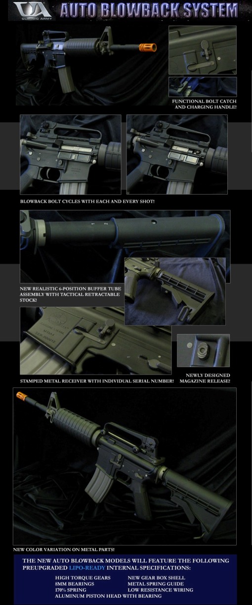 NEW Revolutionary Blowback system ups the realism of your battles or training. The ABS system blows back, cycling the bolt with each shot on full and semi-auto! Works waaay better than other manufacturers versions, watch the video below!
