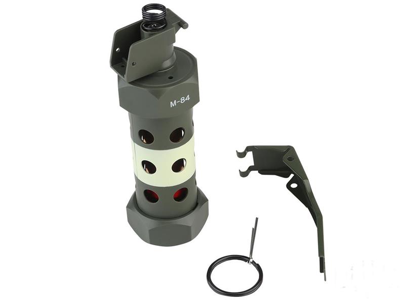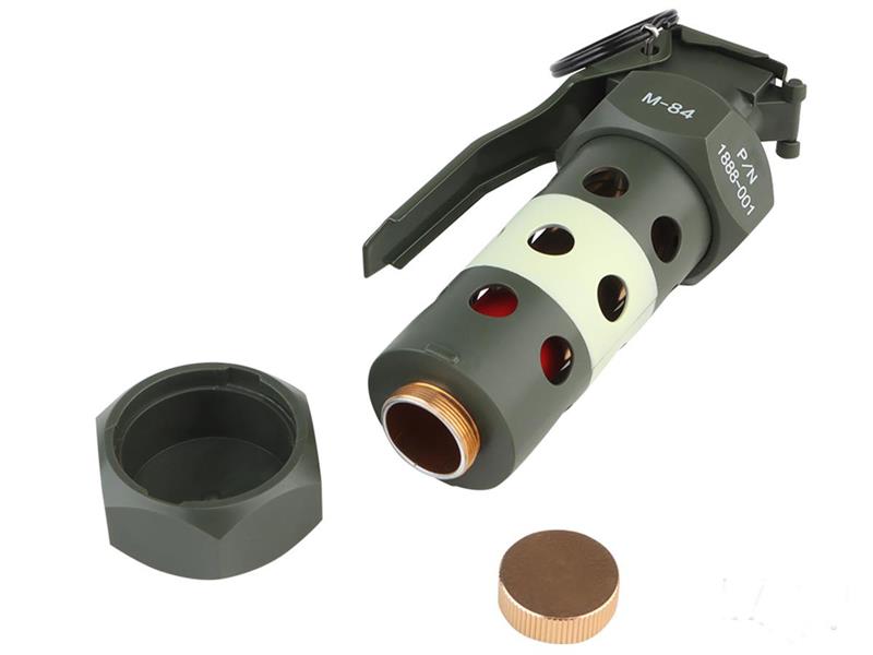 M84 FlashBang Grenade Replica Dummy Inert. Lightweight plastic construction. Removable spoon and fuse assembly. Non-Functional.