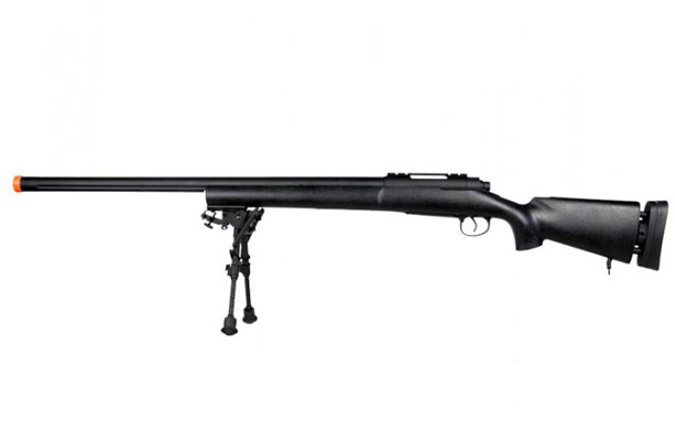 The Echo1 M28 is a high powered and affordable sniper rifle ready for use out of the box. This spring rifle features over 515 fps and is ready for the sniper role, with an included bipod and extra magazines for long duration games. The Echo1 M28 utilizes several barrel stabilizers to keep the inner barrel secure ensuring accurate shots each time. Unlike other spring sniper rifles on the market the M28 is upgradable and can use VSR-10 parts for fine tuning. The outer appearance of the M28 is very appealing with a fluted bull barrel a look found on many military sniper platforms. The M28 also features dense textured frame giving the rifle a sturdy and rugged feel. The ruggedness of the outside is matched by the inside with a metal hop up unit and trigger parts. To reduce weight and increase the FPS a strong 45° polycarb piston is used with an oversized o-ring to create a perfect air seal to boost the FPS of the M28.