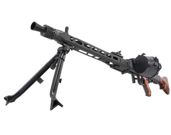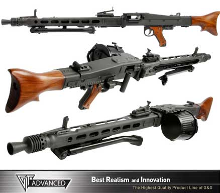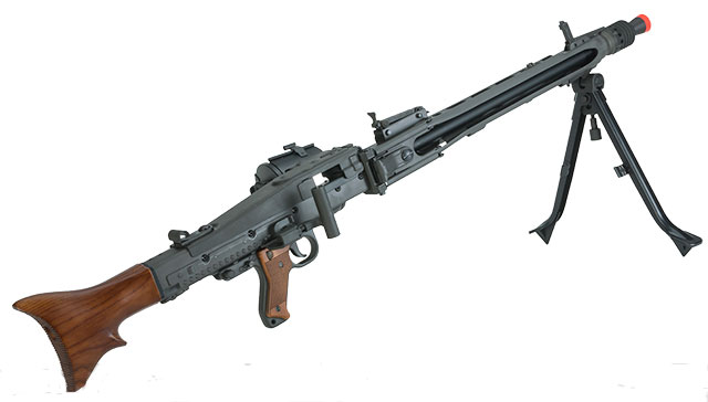 The G&G GMG-42 Airsoft light machine gun is the most realistic Airsoft replica MG-42 to date. The receiver, barrel shroud, barrel and external components are made entirely from stamped steel with a realistic, period correct parkerized style finish. The stock and grip panels are real wood, also with a period correct stain. The GMG-42 fires from an electric winding 1700 round drum magazine ensuring that you have plenty of firepower at your disposal. The gearbox is a proprietary 10mm gearbox featuring 10mm oil-less bushings and a CNC machined aluminum shell. With its high power and high rate of fire the GMG-42 is likely to live up to its inspiration and strike fear into the hearts of your enemies.
