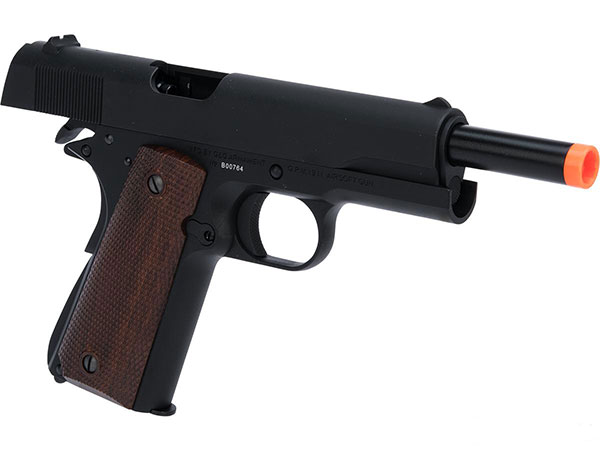 – Single Stack Magazine This 1911 is extremely realistic. The full metal construction and its single stack design make it feel like the actual thing. It features working thumb and grip safeties like the real thing.