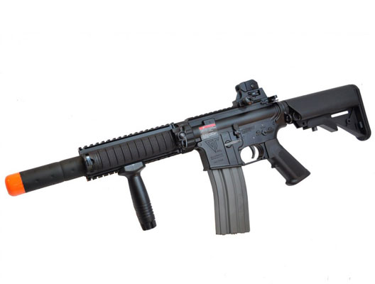 The G&G Top Tech TR4 CQB-S Blowback AEG electric airsoft rifle is part of G&G’s high end series. The gun features a full metal body with removable rear sight as well as full metal rails on the top, front grips, sling adapter, etc. The battery fits in the crane stock. This rifle features G&G’s blowback system for added realism. While not providing the same kick as a gas rifle, or a real rifle, you can still feel the recoil. This is a great airsoft rifle for those interested in M4/M16 variants!