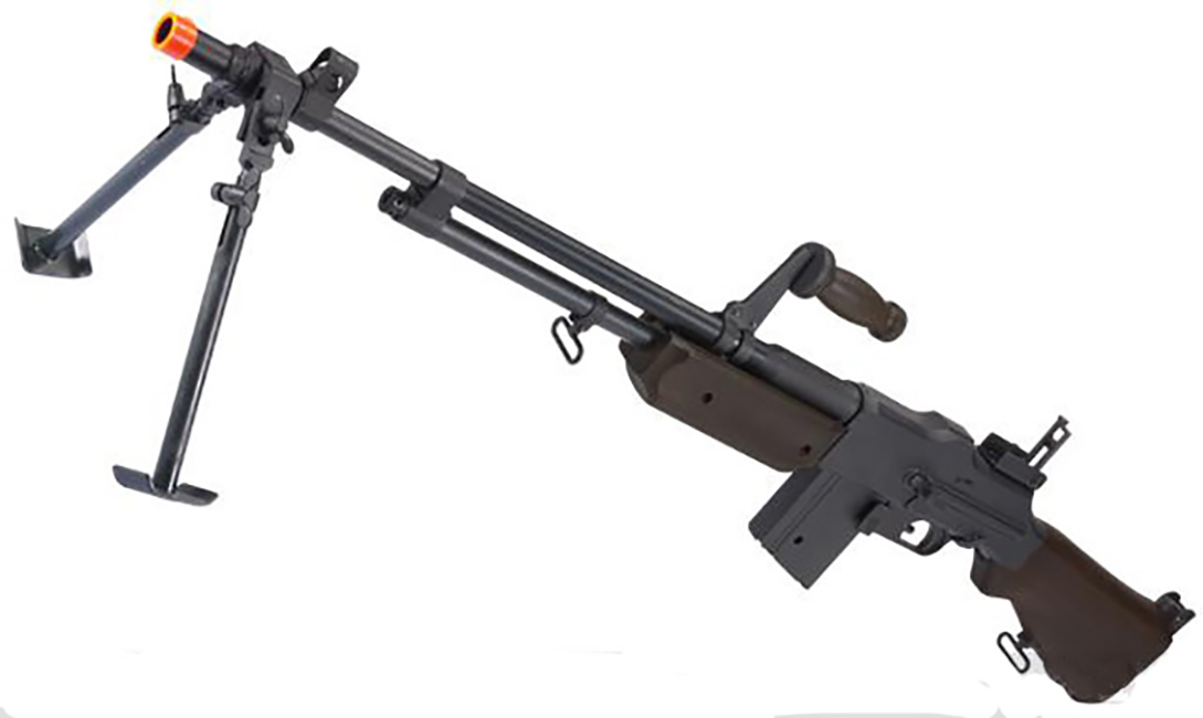 Throughout its service life, the BAR saw action in WW2, the Korean War, and even into Vietnam before it was replaced by the M60 Machine Gun. The S&T Airsoft BAR is a faithful replica of the original. This airsoft adaptation is the perfect AEG to complete any WWII collection or military reenactors impression. The S&T BAR features all metal construction with realistic-looking imitation wood furniture and is designed for realistic field stripping. S&T BAR is no lightweight and it reflects the heavy duty ruggedness of the weapon it was modeled after. Included with the BAR is the optional carry handle and steel bipod to fit the light machine gunner role.