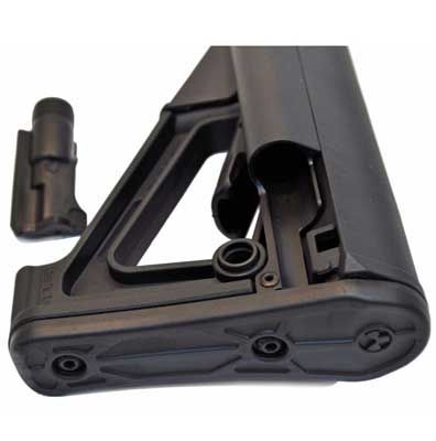 The Magpul STR (Storage/Type Restricted) is a drop-in replacement butt stock for AR15/M16 carbines using mil-spec sized receiver extension tubes. A storage-capable version of the CTR®, the STR has improved cheek weld and two water resistant battery tubes on a compact, reinforced polymer A-frame design. A shielded operation lever and supplemental friction locking system prevent accidental operation and minimize excessive stock movement for enhanced weapon stability and accuracy.*