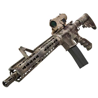 ECO MOD2 4X Magnification 34mm scope with two forward mounted Green Laser pod and Red/White LED Navigation light pod.