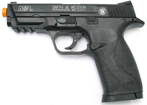 he S&W M&P 40 Gas Non-Blowback CO2 Pistol – Black. A fully licensed S&W airsoft gas pistol that uses standard Co2 cartridges and magazines. Polymer lower frame and full metal upper slide. This is a full scale 1:1 M&P40 pistol. Hop up is non-adjustable (.25g-.32g work best). Magazines holds 15 rounds. Front under rail for attachments (flashlight, grip, laser, etc). Fits in standard M&P holsters.