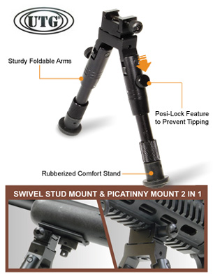 UTG Adjustable Height Extra Low-Profile Shooter’s SWAT Bipod Rubber Feet 6.2″-6.7″ Center Height