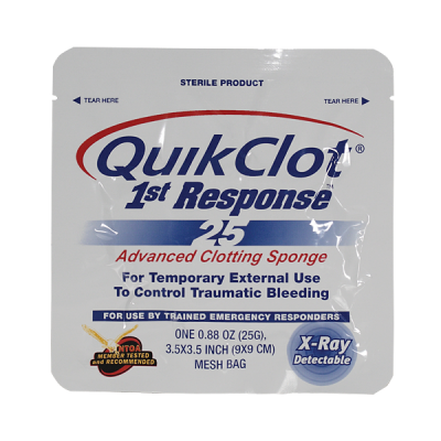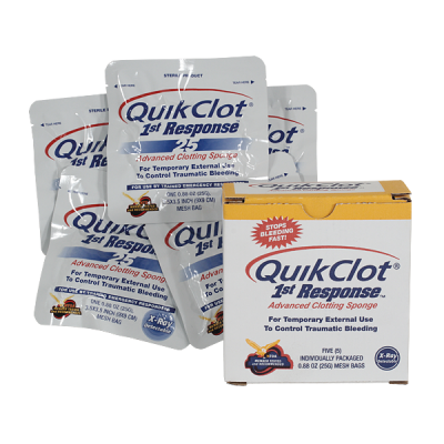 QuikClot 1st Response™ comes in a box that contains five individually packaged .875-ounce (25g) hemostatic sponges – quantities sufficient to address most situations encountered by first responders. Box of five (5).