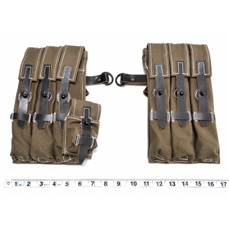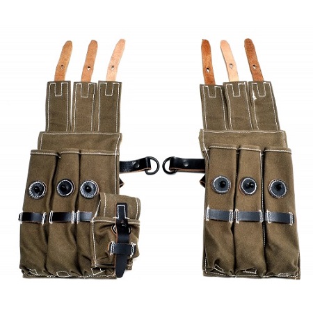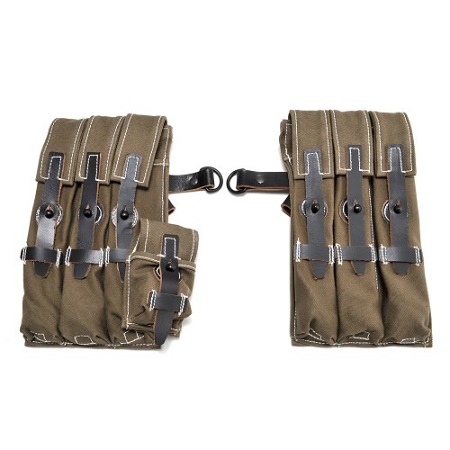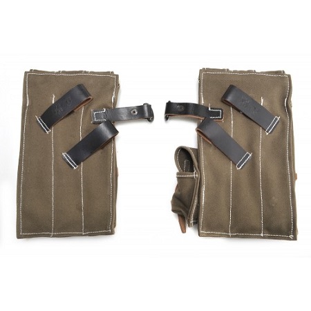 German MP40 Canvas Pouch Set. An exact replica utilizing the same materials and patterns as the original issue. These types of pouches were used by German Troops during WW2. Black leather straps, heavy canvas with white thread.