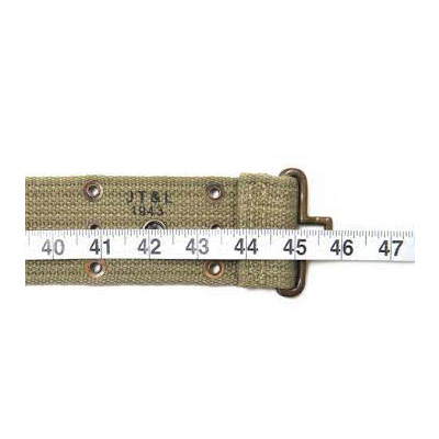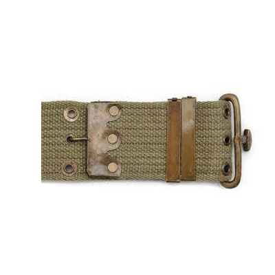 US M1936 Pistol Belt WWII is an exact reproduction. The pistol belt was intended for soldiers, officers or crews of tanks or other equipment. On left side, between first two sets of grommets, was a large snap fastener. This mated with snap on the .45 cal automatic pistol magazine pouch (Pocket, Magazine, Web, M-1923 or M-1918) which slipped over the pistol belt with a loop of webbing on the back. For garrison duty, a pistol holster (Holster, .45 Automatic, M-1916 attached with hook fastener, made of tan/brown leather) and the web magazine pouch for two magazines might be all that was attached to the belt. In the field, at least a canteen and a first aid pouch were added. Many other items were optionally attached to the pistol belt.. Can be used with our M36 or M44 Combat Field Suspenders.