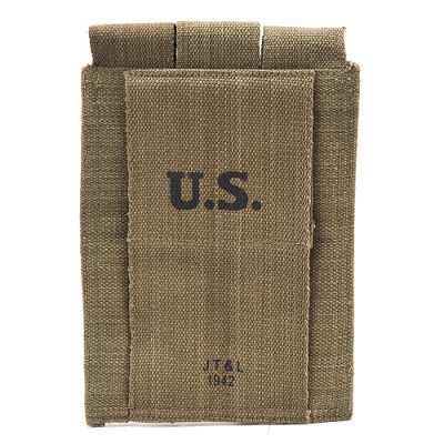 Reproduction of the Thompson 3 Cell Magazine Pouch which was the standard issue for soldiers and Marines equipped with M1a1 Thompson SMG during WWII. These are made from 100% cotton webbing, each pocket closes with a press fastener. Marked JT&L 1942